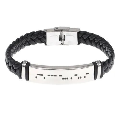 Материал и изготовление: Изготовлен из кожи и нержавеющей стали, имеет плетёную структуру и гравировку.