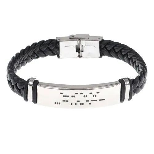Кожаный браслет с плетёной текстурой и гравировкой.