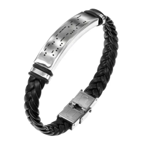 Кожаный браслет с гравировкой 'Удача в любви'. Изготовлен из кожи и нержавеющей стали, имеет плетёную структуру.
