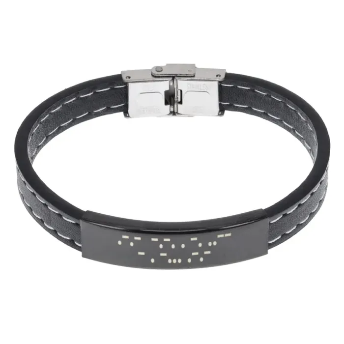 Кожаный браслет с гравировкой текста, предназначенный в качестве сувенира или аксессуара.