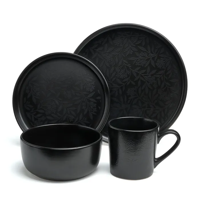 Набор обеденной посуды на 4 персоны из коллекции CHOICE бренда Bronco предназначен для сервировки стола. В комплект входит 16 предметов, выполненных из керамики в классической чёрно-белой гамме с рельефным цветочным орнаментом.