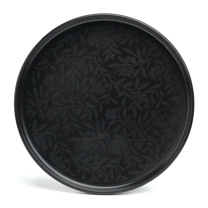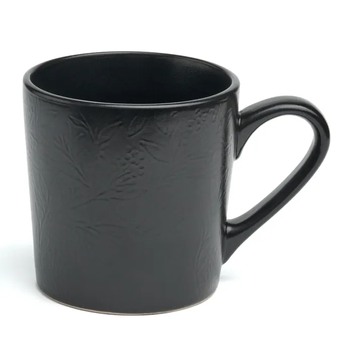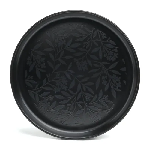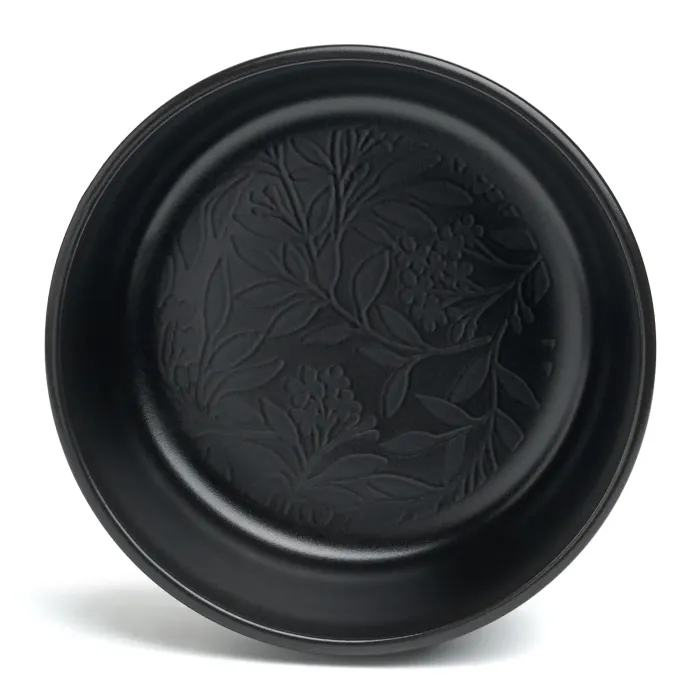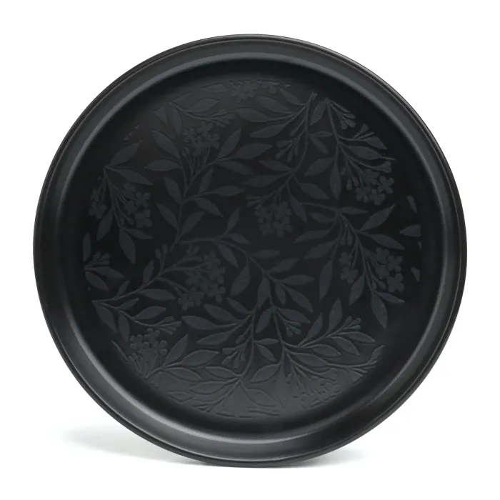 Посуда изготовлена из керамики, что обеспечивает высокую износостойкость для ежедневного использования. Чёрная поверхность изделий имеет текстуру, напоминающую чугун. Декор выполнен в виде рельефного орнамента с мотивами цветов и трав.