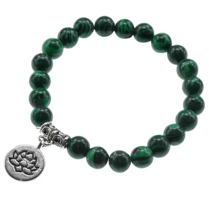 Браслет из синтетического камня малахит 8мм с подвеской Лотос 14мм BJBS-172-1