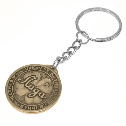 Именной брелок с женским именем Лидия, изготовленный из латуни, диаметром 30 мм.