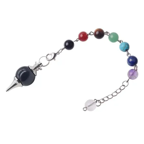 Маятник для биолокации из натурального черного агата с цепочкой, украшенной цветными каменными бусинами.
