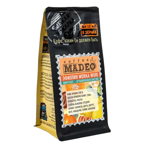 Плантационный кофе Madeo из Эфиопии Worka Wuri — это арабика, выращенная на высоте 2100 метров. Средняя обжарка раскрывает сложный профиль с нотами карамели, цветов и цитруса, создавая сбалансированный вкус со средней кислотностью, плотностью и горчинкой.