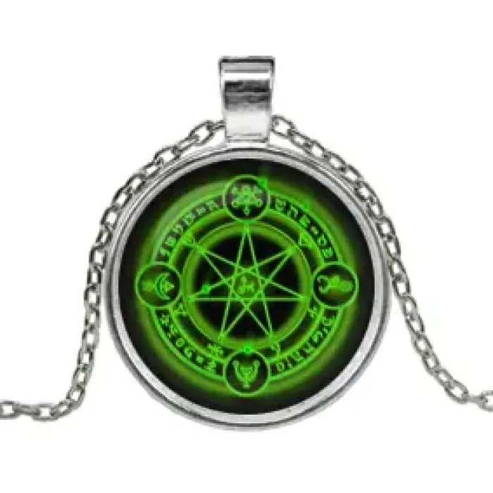 Кулон с цепочкой "Магическая печать" — это стильный амулет, выполненный из серебристого металла и украшенный выпуклой стеклянной линзой. Он символизирует защиту и силу, что делает его отличным подарком для тех, кто ценит магию и мистику. Основные особенности: