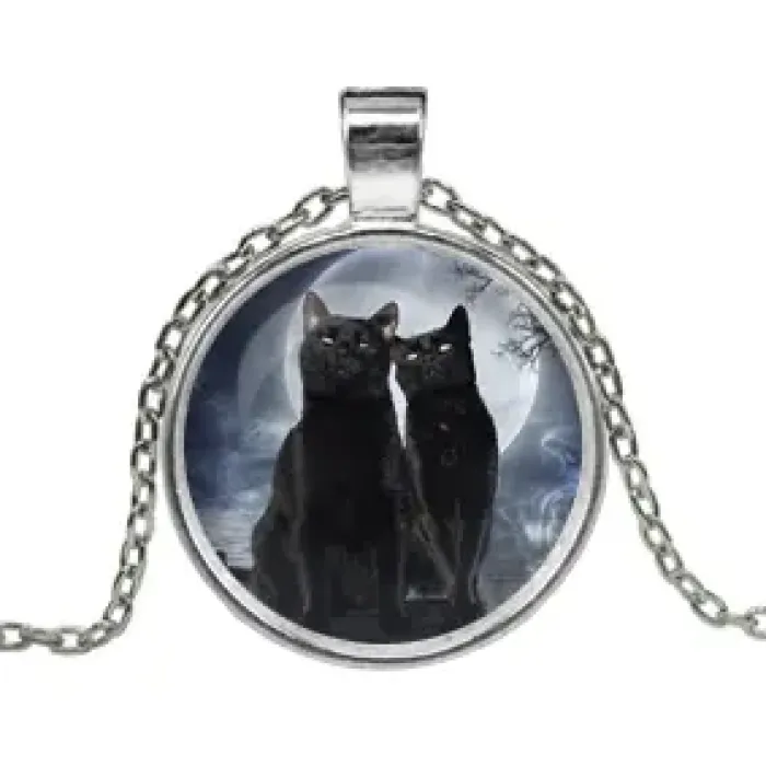 Кулон с цепочкой Чёрные коты — это стильный амулет, который сочетает в себе элегантность и символику. Изготовленный из серебристого металла, он украшен выпуклой стеклянной линзой, что придаёт изделию уникальный вид. Этот кулон может стать прекрасным подарком для любителей кошек или тех, кто ценит необычные аксессуары.