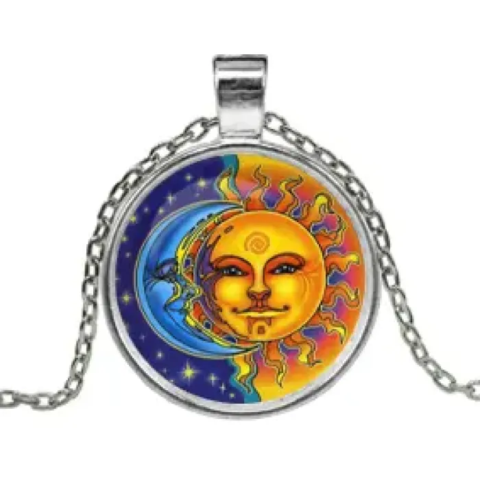 Кулон с цепочкой Солнце и луна — это стильный амулет, который сочетает в себе символику солнечного света и ночного спокойствия. Изготовленный из серебристого металла, кулон украшен выпуклой стеклянной линзой, что придаёт ему уникальный вид.