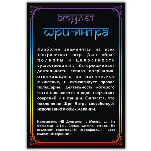 Амулет Шри-янтра — это уникальный сувенир, который сочетает в себе древнюю символику и современный дизайн. Этот амулет традиционно используется для привлечения гармонии и благополучия в жизнь. Изображение под выпуклой стеклянной линзой создает эффект глубины и придаёт изделию особую привлекательность.