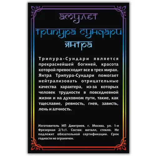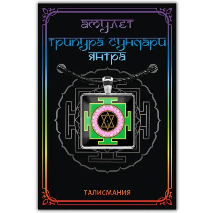Амулет Трипура Сундари-янтра — это уникальный аксессуар, который сочетает в себе эстетическую красоту и глубокий символизм. Изображение под выпуклой стеклянной линзой создает эффект объема, привлекая внимание и придавая изделию особую выразительность.