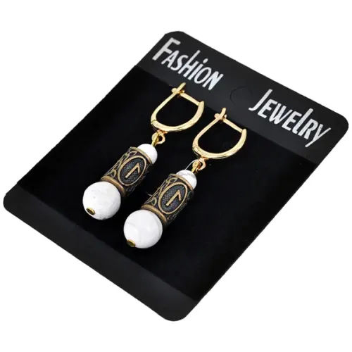 Материал и изготовление: Бусины из натурального камня кахолонг, рунические бусины из латуни. Швензы из бижутерного сплава с гипоаллергенным покрытием.