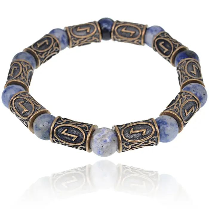 Рунический браслет с натуральным камнем содалит и символом руны Эйваз. Стрейч-дизайн.