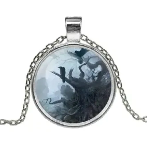 Кулон с цепочкой Вороны — это стильный амулет, который сочетает в себе элегантность и мистику. Изготовленный из серебристого металла, он украшен выпуклой стеклянной линзой, что придаёт ему уникальный вид. Этот кулон традиционно ценится за свою символику, связанную с мудростью и защитой.