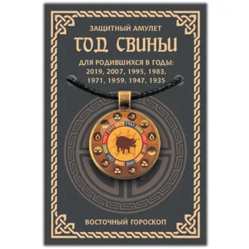 Амулет Восточный Гороскоп - Год Свиньи является защитным символом, который традиционно используется для привлечения удачи и гармонии. Этот амулет предназначен для людей, родившихся в год Свиньи: 2019, 2007, 1995, 1983, 1971, 1959, 1947 и 1935 годов.