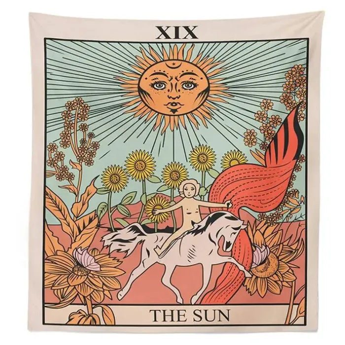 Настенный гобелен Таро 'The Sun' — это яркое произведение искусства, которое привнесет в интерьер атмосферу тепла и света. Символика солнца олицетворяет радость и позитив, что делает этот гобелен идеальным выбором для создания уютного пространства.
