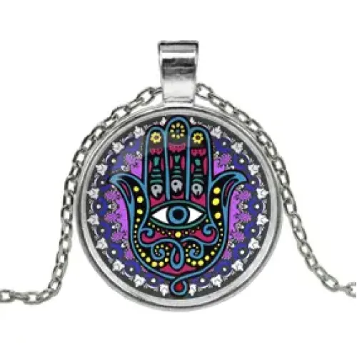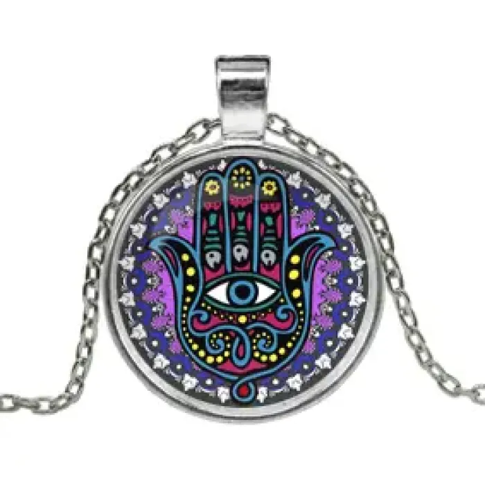 Кулон с цепочкой Рука Фатимы — это стильный амулет, который сочетает в себе красоту и символику. Изготовленный из серебристого металла на основе алюминия, он украшен выпуклой стеклянной линзой, что придаёт ему особый шарм. Этот кулон традиционно считается защитным оберегом, олицетворяющим силу и защиту от негативных энергий.