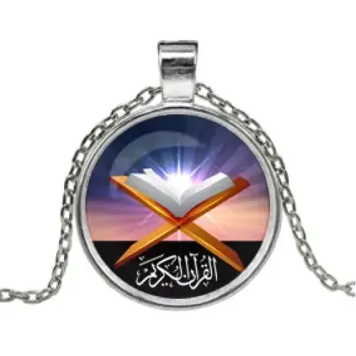 Кулон с цепочкой Коран — это стильный амулет, который сочетает в себе красоту и символизм. Изготовленный из серебристого металла (сплав на основе алюминия), он украшен выпуклой стеклянной линзой, что придаёт изделию особый шарм. Комплектуется цепочкой с замком, позволяющей удобно носить кулон на шее.