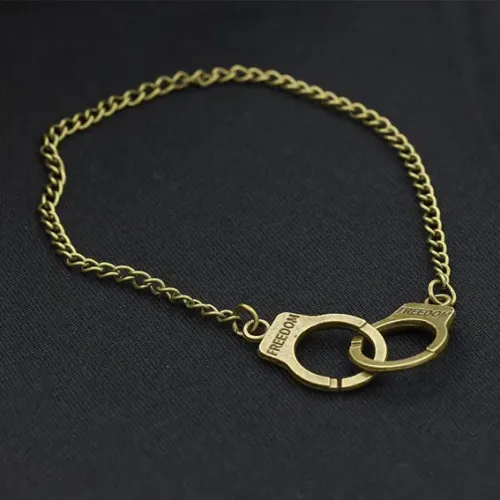 - Уникальный дизайн: браслет выполнен в виде цепочки с наручниками, что придаёт ему оригинальность.