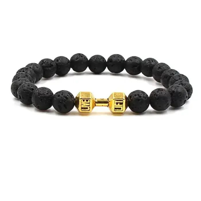 Браслет Гантеля из натурального камня лава — это стильный и мощный аксессуар, который подходит как мужчинам, так и женщинам. Изготовленный из прочной лавы диаметром 8 мм, этот стрейч-браслет символизирует силу и уверенность. Его уникальный золотистый оттенок добавляет нотку элегантности в любой образ.