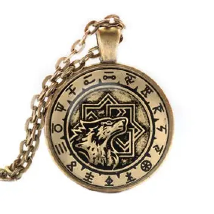Кулон-амулет с изображением волка и молвинца — символа силы и защиты. Изготовлен из металла с выпуклой стеклянной линзой, покрыт бронзовым напылением, что придаёт ему уникальный вид. В комплекте идет стильная цепочка с надежным замком, позволяющая носить украшение на шее. Упаковка выполнена в виде прозрачного полипропиленового пакетика без подвеса, что делает его идеальным для подарка или личного использования. Этот кулон традиционно ценится за свою связь с природными силами и может стать отличным дополнением к любому образу.
