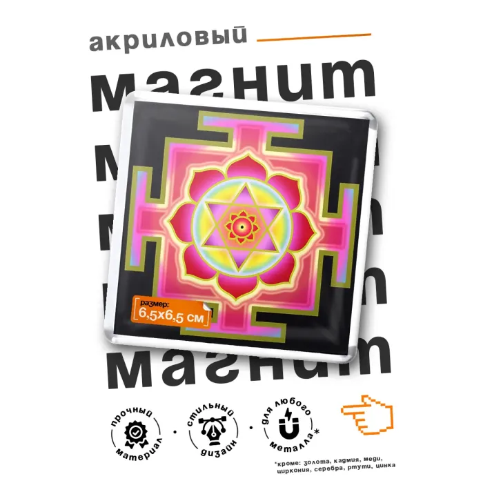 Этот квадратный акриловый магнит с изображением янтры Камала станет не только стильным украшением интерьера, но и символом гармонии и благополучия. Янтра традиционно используется в индийской культуре для привлечения удачи и защиты от негативной энергии.