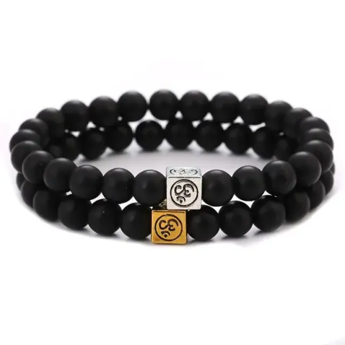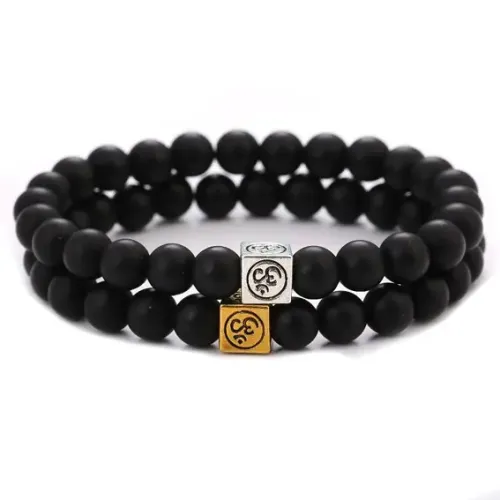 Двойной браслет Ом из синтетического шунгита — это стильный аксессуар, который сочетает в себе красоту и символику. Браслеты украшены бусиной с изображением знака Ом, что придаёт им особый смысл и делает их идеальными для тех, кто ищет гармонию и спокойствие.