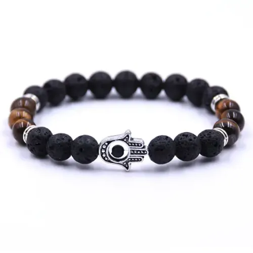 Браслет Хамса — это стильный стрейч-браслет из натурального камня с символом Руки Фатимы. Этот амулет традиционно считается защитным и приносит удачу своему обладателю. Браслет выполнен из качественной лавы и тигрового глаза диаметром 8 мм, что обеспечивает его прочность и долговечность.