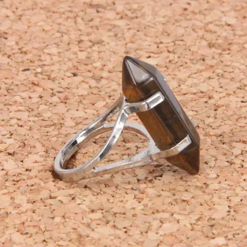 Кольцо с натуральным камнем Тигровый глаз. Дизайн в форме шестигранного маятника, камень подвижен в гнезде.