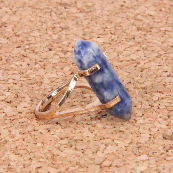 Кольцо с натуральным камнем содалит. Камень шестигранной формы размещён в гнезде, позволяющем ему немного шевелиться.
