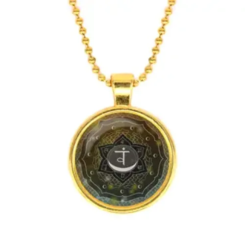 Кулон с цепочкой в виде символа Свадхистхана чакры. Изготовлен из бижутерного сплава с золотым покрытием, имеет выпуклую стеклянную линзу.