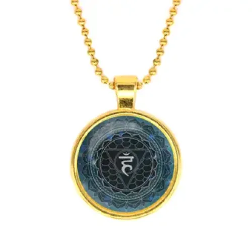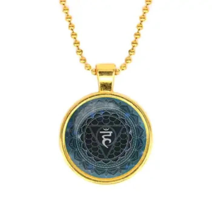 Кулон с цепочкой Вишуддха чакра из бижутерного сплава с золотым покрытием и выпуклой стеклянной линзой.