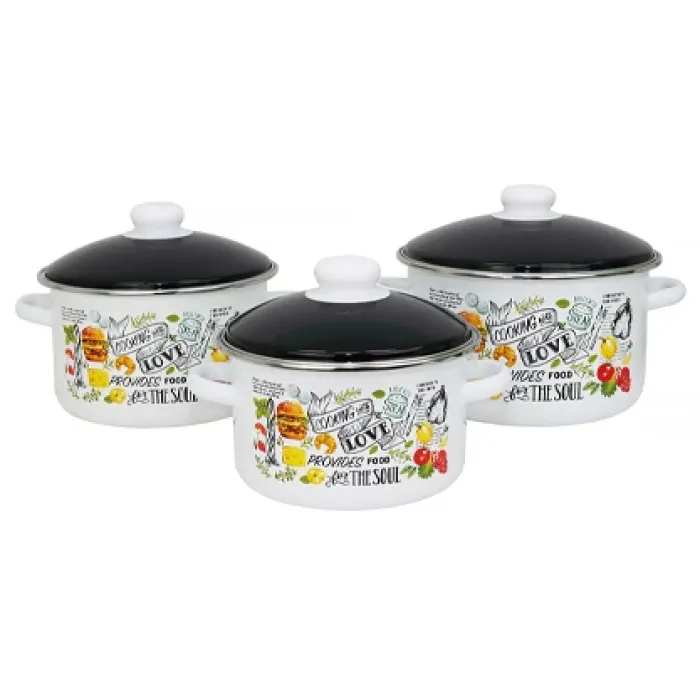 - Материал: сталь с эмалевым покрытием- Количество предметов в наборе: 3- Объём кастрюль: 2.0 л, 3.0 л, 4.0 л- Форма: цилиндрическая- Совместимость с плитами: все виды, включая индукционные- Особенности ухода: допускается мытьё в посудомоечной машине