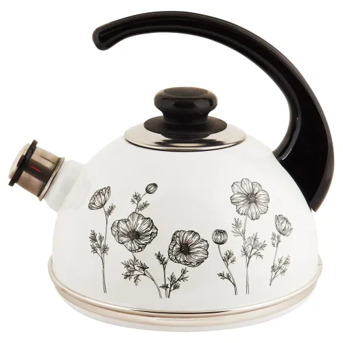 Эмалированный чайник объёмом 2,5 литра предназначен для кипячения воды на плите. Изделие выполнено в белом цвете с чёрными элементами и декоративным узором «Космея».