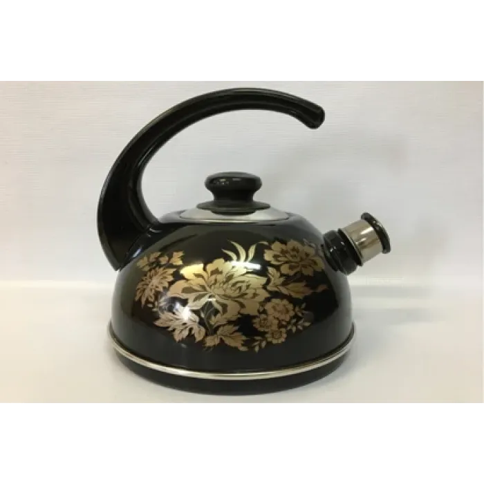 Корпус чайника выполнен из эмалированной стали, что обеспечивает устойчивость к коррозии. Ключевые элементы — ободок, крышка и свисток — изготовлены из нержавеющей стали для прочности и долговечности. Консольная ручка чёрного цвета обеспечивает удобный захват, а свисток сигнализирует о закипании воды.