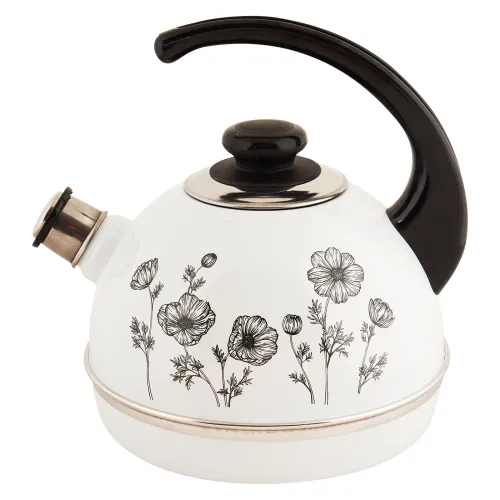 Корпус чайника изготовлен из стали с эмалевым покрытием, которое обеспечивает гигиеничность и устойчивость к коррозии. Крышка, ободок и свисток выполнены из нержавеющей стали, что повышает прочность и долговечность этих элементов. Ручка имеет эргономичную форму для удобного использования.