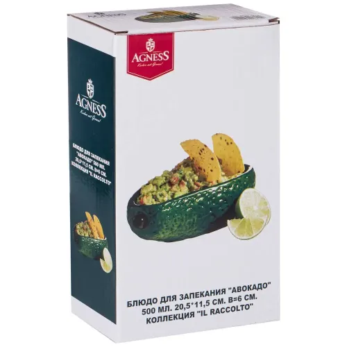 Блюдо можно использовать для приготовления и последующей сервировки на столе. Оно гармонично сочетается с другой посудой бренда Agness из коллекции Il Raccolto. Природный дизайн в форме авокадо подходит для создания оригинальной подачи блюд.
