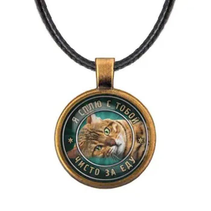 Кулон из бижутерного сплава с покрытием под бронзу и выпуклой стеклянной линзой.