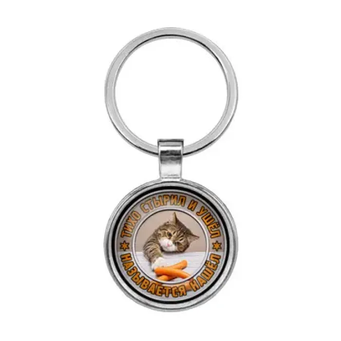 Брелок из бижутерного сплава со сталью и стеклом, с изображением под выпуклой линзой.