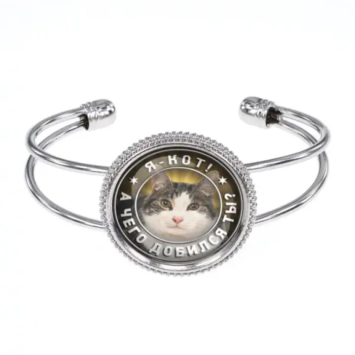Браслет с изображением кота и надписью. Изготовлен из бижутерного сплава со стеклянным элементом.