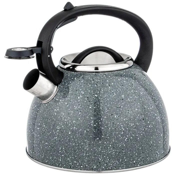 Корпус чайника выполнен из нержавеющей стали. Конструкция включает ненагревающуюся ручку с клапаном для наливания и встроенный свисток, сигнализирующий о закипании. Дно имеет специальный слой для работы на индукционных плитах.
