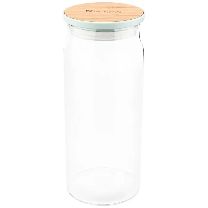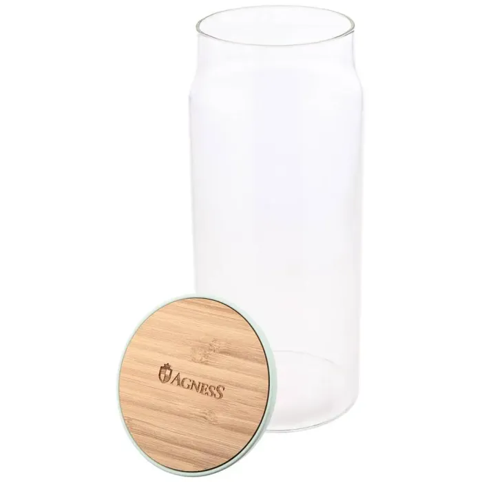 Основной материал — жаропрочное стекло, устойчивое к перепадам температур. Крышка из бамбука обеспечивает плотное закрытие, способствуя сохранению свежести продуктов. Конструкция имеет цилиндрическую форму, что облегчает хранение и экономит пространство.