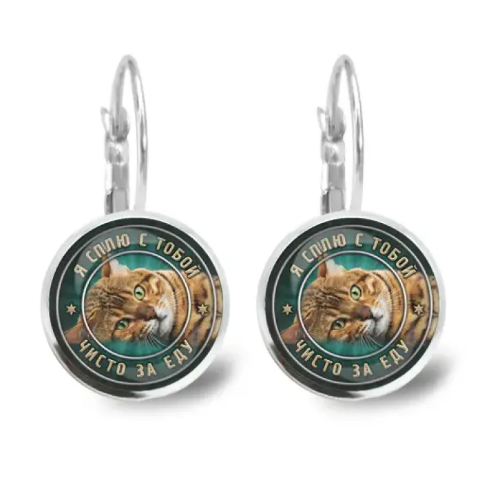 Серьги с надписью «Я сплю с тобой за еду». Бижутерный сплав, выпуклые стеклянные линзы, замок типа левербэк.