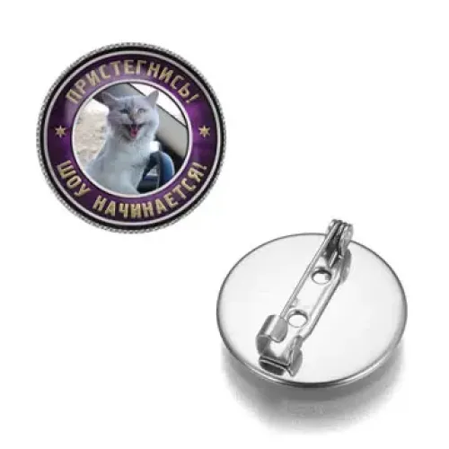Значок для одежды из бижутерного сплава с изображением под выпуклой стеклянной линзой.