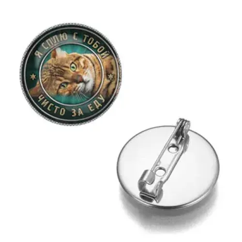 Значок из бижутерного сплава с покрытием под серебро и выпуклой стеклянной линзой.