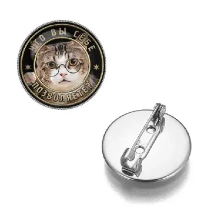 Значок с фразой «Что вы себе позволяете?». Материал — бижутерный сплав с покрытием под серебро и стеклом.
