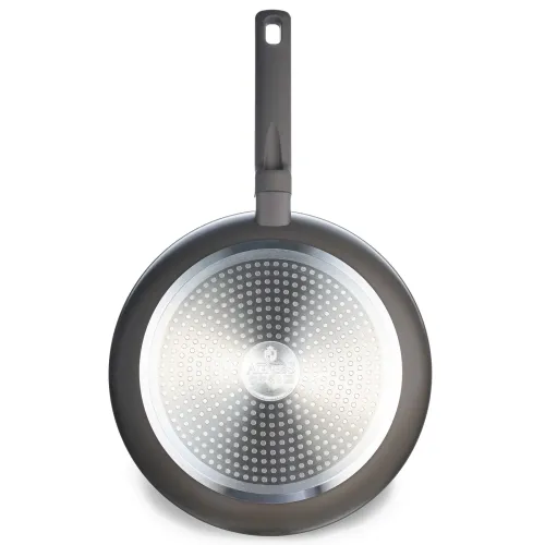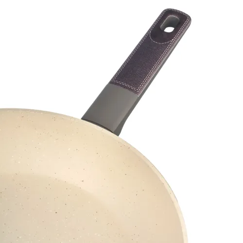 Корпус изделия изготовлен из кованого алюминия, что способствует равномерному распределению тепла. Многослойное антипригарное покрытие не содержит PFOA. Эргономичная ручка из бакелита оснащена декоративными вставками и рассчитана на комфортный хват, она не нагревается в процессе готовки.