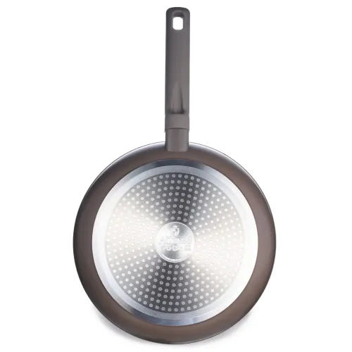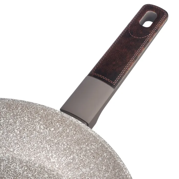 Корпус выполнен из кованого алюминия, что способствует равномерному нагреву. Трехслойное антипригарное покрытие Pfluon Marble не содержит PFOA и рассчитано на высокую износостойкость. Эргономичная ручка из бакелита с декоративными вставками устойчива к нагреву и обеспечивает безопасный хват.