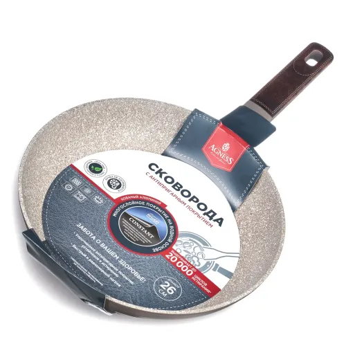 Сковорода Agness с антипригарным покрытием Pfluon Marble предназначена для жарки и тушения. Основное преимущество — усиленное покрытие CONSTANT, обеспечивающее готовку с минимальным количеством масла, и совместимость со всеми типами плит.