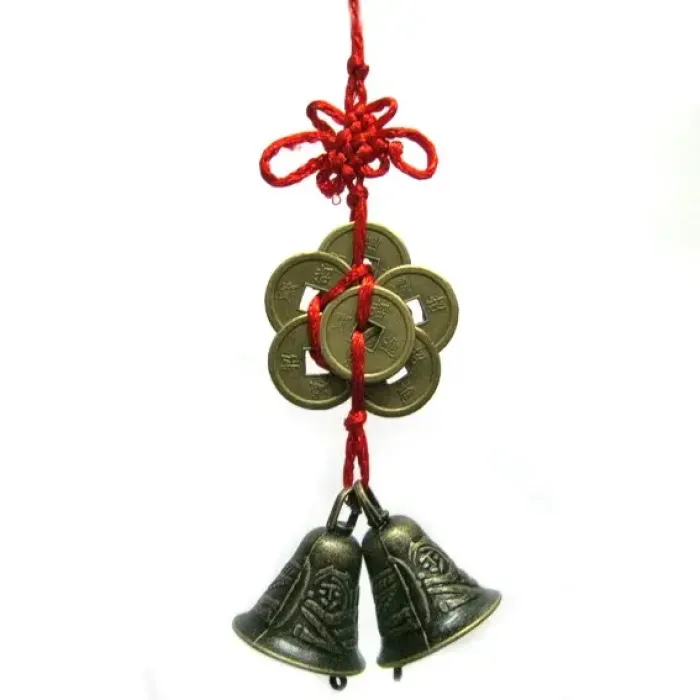 Подвеска Фэн Шуй 7 монет, 2 колокола металл 16см Z181